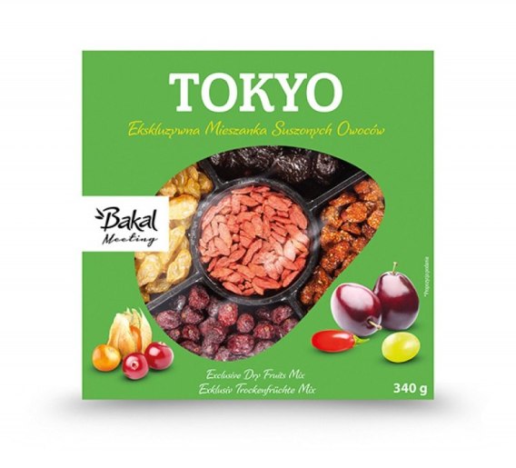 Ekskluzywna mieszanka suszonych owoców o wyjątkowym i zrównoważonym smaku_opakowanie zawiera zestaw niezwykle wartościowych suszonych owoców, tworzą go żurawina 60g, rodzynki gold 80g, jagody Goji 40g, śliwki 10g i miechunka 60g doceniona już przez starożytnych Inków i nazywana _złotą jagodą___wszystkie owoce są bogate w witaminy i składniki mineralne oraz są źródłem oryginalnych i wyjątkowych smaków_waga: 340g_SŁADNIKI:_1. Śliwki suszone (śliwki 99,9%, substancja konserwująca: sorbinian potasu) 29%_2. Rodzynki Jumbo Gold (rodzynki 99%, olej słonecznikowy, substancja konserwująca: dwutlenek siarki) 23%_3. Miechunka suszona (miechunka, cukier trzcinowy) 18%_4. Żurawina suszona słodzona (żurawina suszona 55-65%, cukier trzcinowy 35-45%, olej słonecznikowy 0,3-1,0%) 18%_5. Jagody goji 12%_WARTOŚCI ODŻYWCZE W 100g PRODUKTU:_Wartość energetyczna 1132 kJ/ 267 kcal_Tłuszcz 0,7 g_W tym kwasy tłuszczowe nasycone 0,2 g_Węglowodany 59 g_W tym cukry 49 g_Białko 3,2 g_Sól 0,17 g