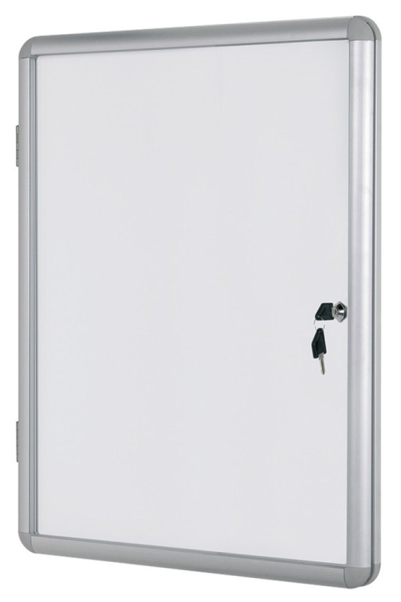 Gablota z powierzchnią suchościeralno-magnetyczną_do użytku wewnętrznego_mocowanie notatek za pomocą magnesów_zamykana na kluczyk_owalna, wąska rama wykonana z anodowanego aluminium_trwała witryna z mocnego tworzywa akrylowego, zapewnia doskonałą przejrzystość_w komplecie 2 klucze oraz zestaw mocujący do ściany_rozmiar tablicy: 67x93cm_głębokość wewnętrzna: 1,8cm_pojemność: 9 dokumentów w formacie A4_produkt pakowany jednostkowo w karton ochronny_kolor biały