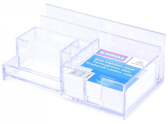 1 przegroda (94x94mm) na karteczki (w komplecie ok. 300 sztuk) _1 przegroda na artykuły piszące _ _jeż_ (74x43mm)_3 przegrody na drobne artykuły biurowe (gumka, temperówka, dodatkowe grafity, itp.)_2 przegrody na stojące dokumenty, broszurki, foldery, itp. _wykonany z przezroczystego polistyrenu odpornego na pęknięcia_wymiary: 200x117x78mm