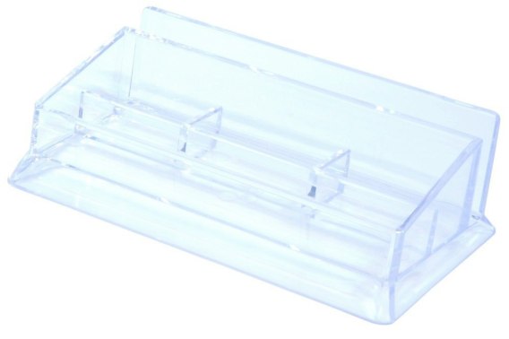 Transparentny_1 przegroda na linijkę, akcesoria piszące umieszczone w pozycji poziomej_3 przegrody na małe artykuły biurowe, np. gumki, pinezki, spinacze_1 przegroda na koperty_wykonany z przezroczystego polistyrenu odpornego na pęknięcia_wymiary: 215x110x60mm