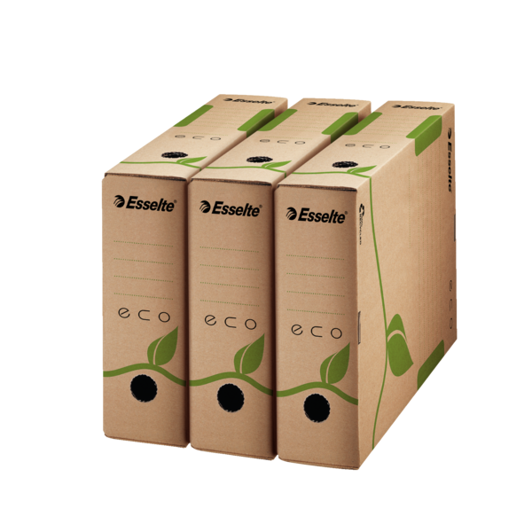 Wykonane w 100% z kartonu z odzysku; z 85% udziałem surowców pochodzących z odpadów konsumpcyjnych. Rozmiar pudeł zoptymalizowany do dokumentów A4. W naturalnym brązowym kolorze, bez użycia wybielaczy. W 100% do ponownego przetworzenia; posiadają certyfikat FSC. Nadruk wykonany przy użyciu ekologicznych farb bazujących na wodzie. Grzbiet 80 mm.